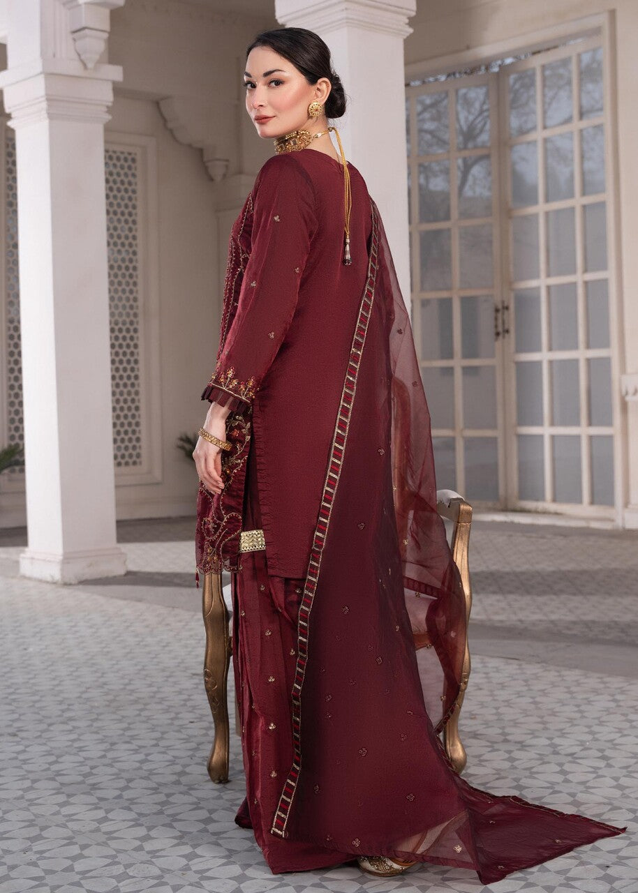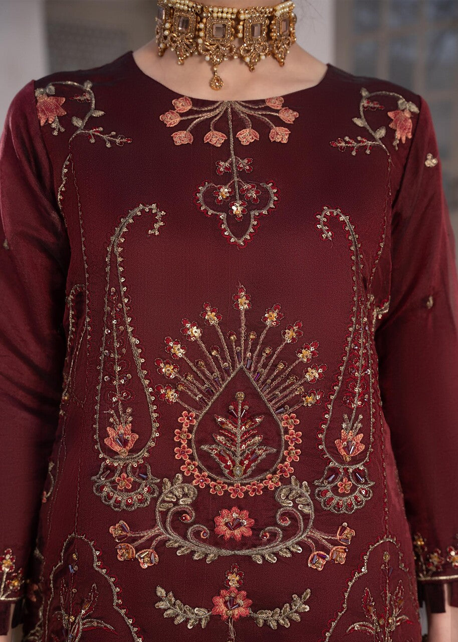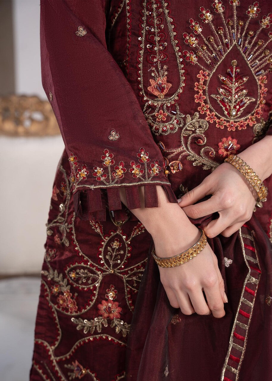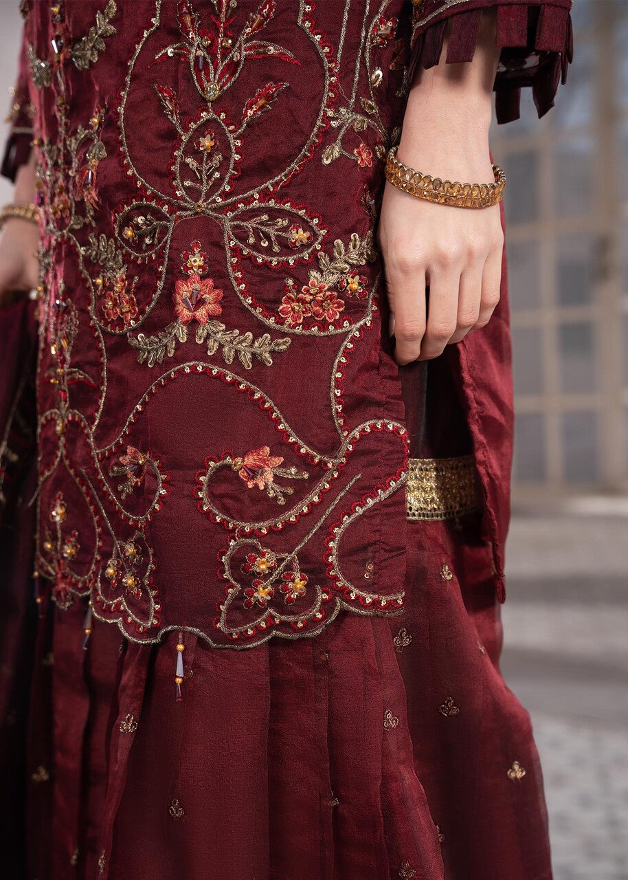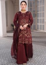 Gender:Â Womenn Category:Â Clothingn Outfit Type:Â Eastern Ready to wearn Sub-Category:Â Ghararan Bottom Style:Â Flared Ghararan Color Type:Â Magenta Hazen Dupatta Fabrics:Â Organzan Number of Pieces:Â 3 Piece