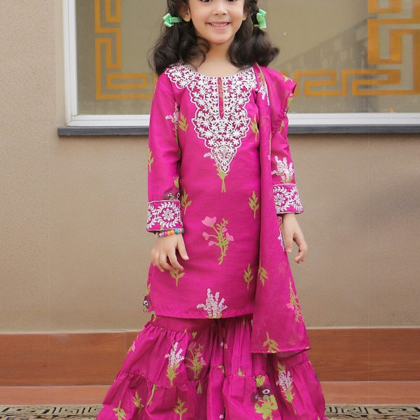 Gender:Â Girln Category:Â Clothingn Outfit Type:Â Easternn Sub-Category:Â Ghararan Bottom Style:Â Ghararan Color Type:Â Hot Pinkn Dupatta Fabrics:Â Netn Number of Pieces:Â 3 Piece – Top + Bottom