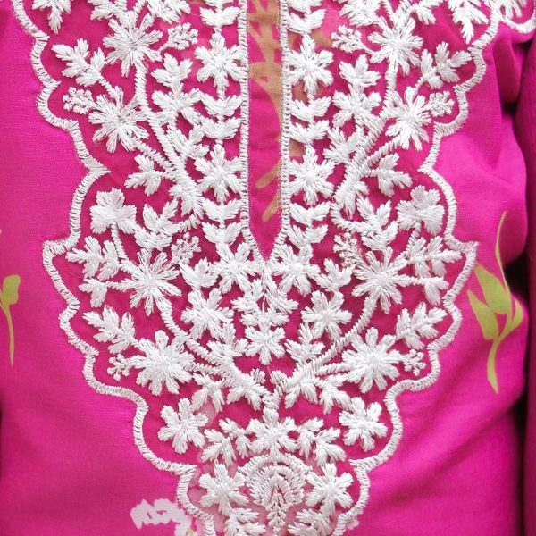 Gender:Â Girln Category:Â Clothingn Outfit Type:Â Easternn Sub-Category:Â Pishwasn Bottom Style:Â Straight Trousern Color Type:Â Zinnia Pinkn Dupatta Fabrics:Â Chiffonn Number of Pieces:Â 3 Piece – Top +