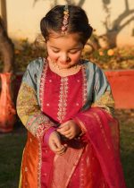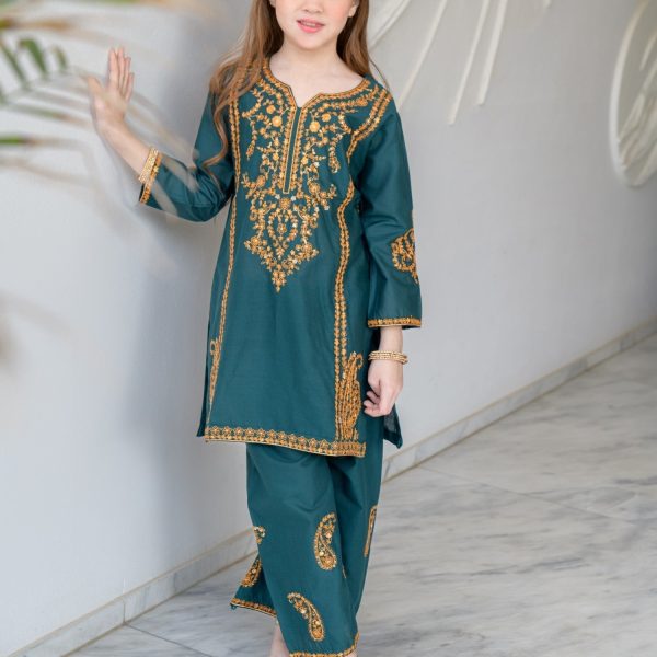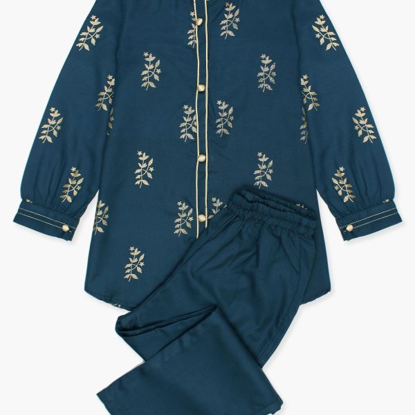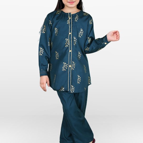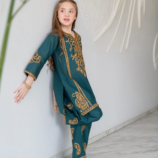 Gender:Â Girln Category:Â Clothingn Outfit Type:Â Easternn Sub-Category:Â Kurta Setn Color Type:Â Tealn Number of Pieces:Â 2 Piece – Top & Bottomn Product Type:Â Festive/Party Wearn Season:Â Summer