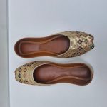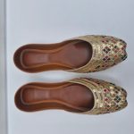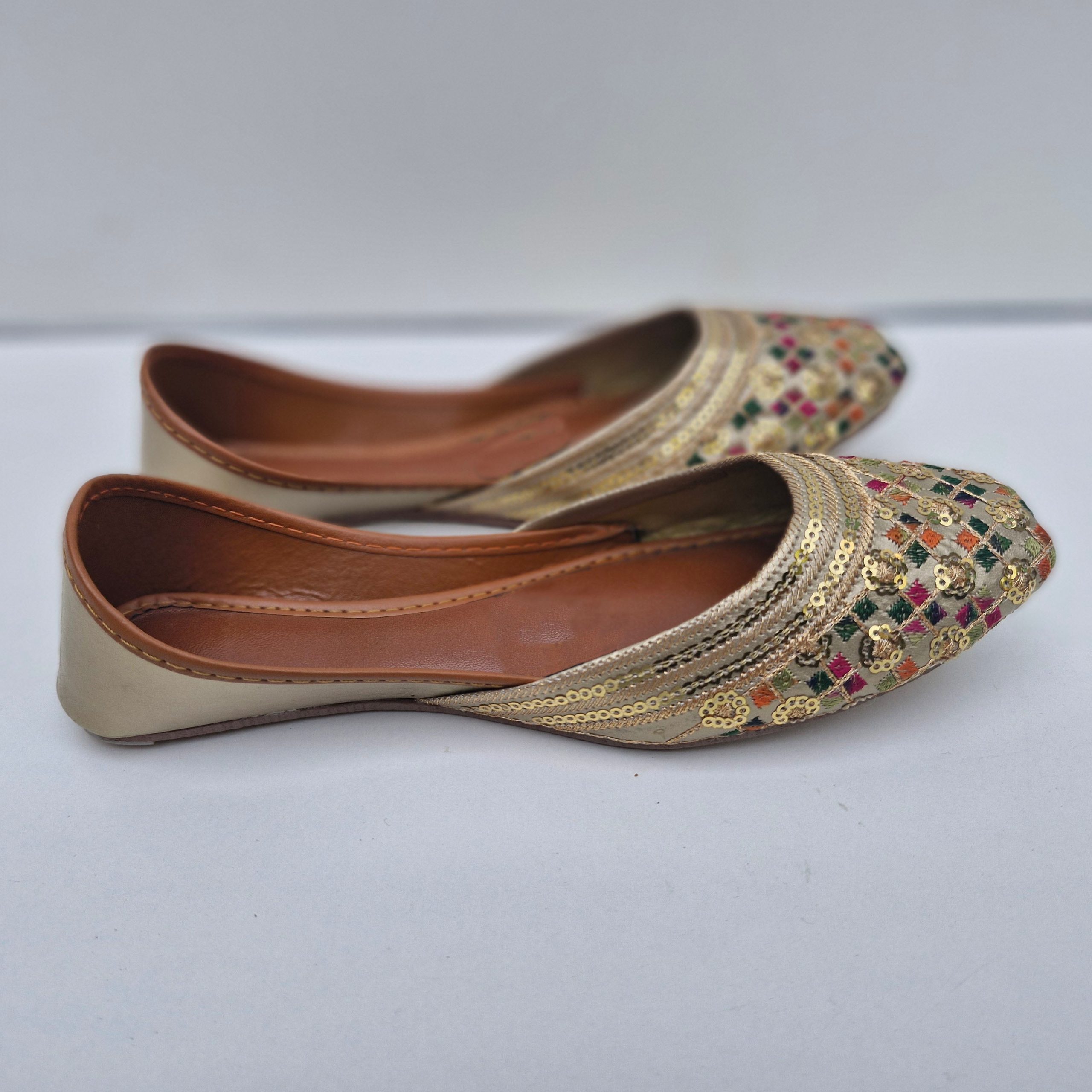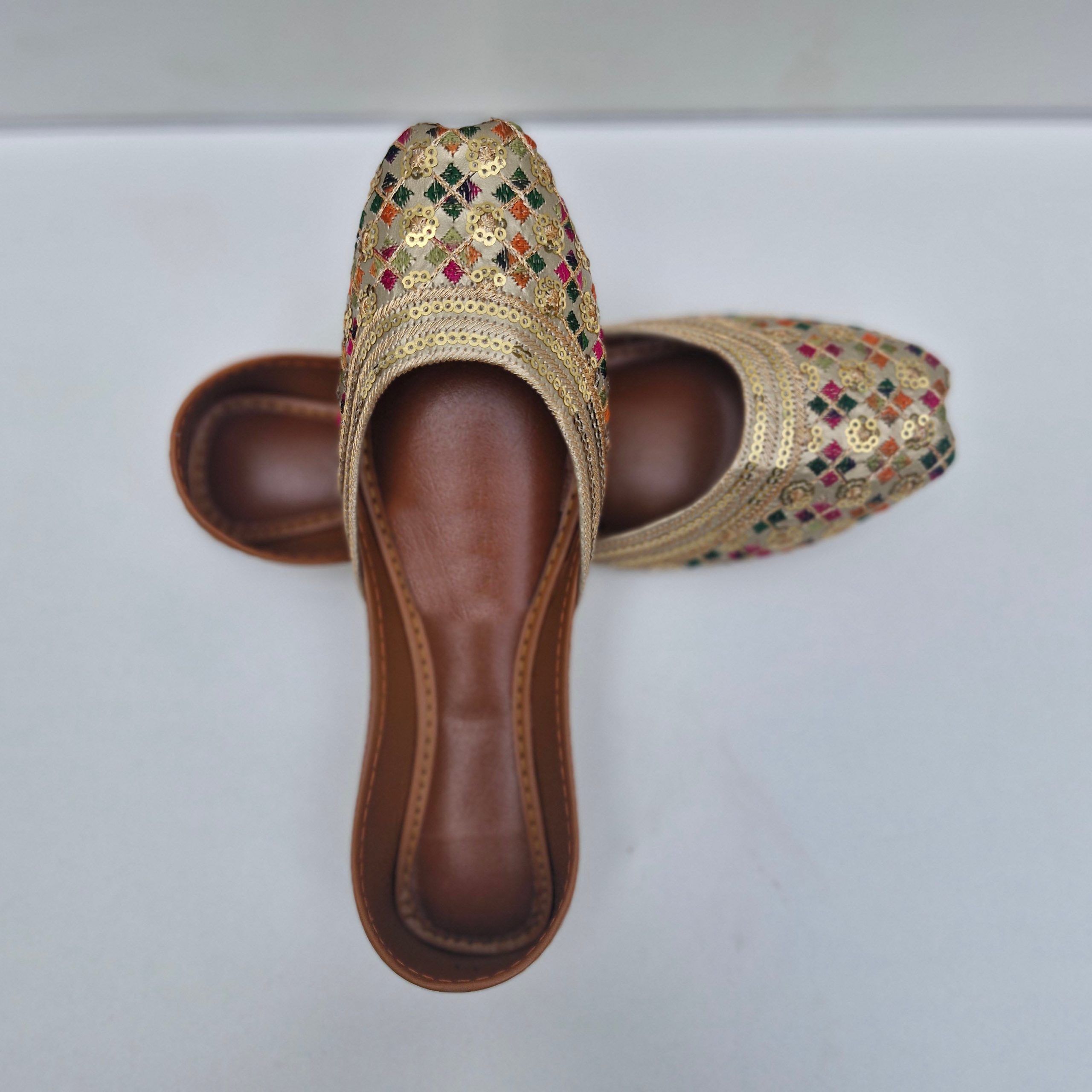 Additional Description: These stunning khussa shoes have a beautiful golden base that’s covered in amazing colorful sequin work! The entire surface is decorated with tiny diamond-shaped sequins in vibrant colors like red, green, purple, orange, and blue, creating a gorgeous mosaic pattern that sparkles beautifully.nThe golden fabric base perfectly complements the multicolored sequins, and you can see intricate golden threadwork around the edges that adds an elegant finishing touch. The traditional pointed toe design gives them that classic khussa look we all love.nInside, they’re lined with soft brown leather for comfort, making them perfect for long wear. These are definitely show-stopping shoes that would be amazing for weddings, parties, or any festive celebration where you want to shine! The colorful sequin work catches the light from every angle, making them absolutely eye-catching. They’re a perfect mix of traditional craftsmanship and glamorous style that will make you feel like a queen!n