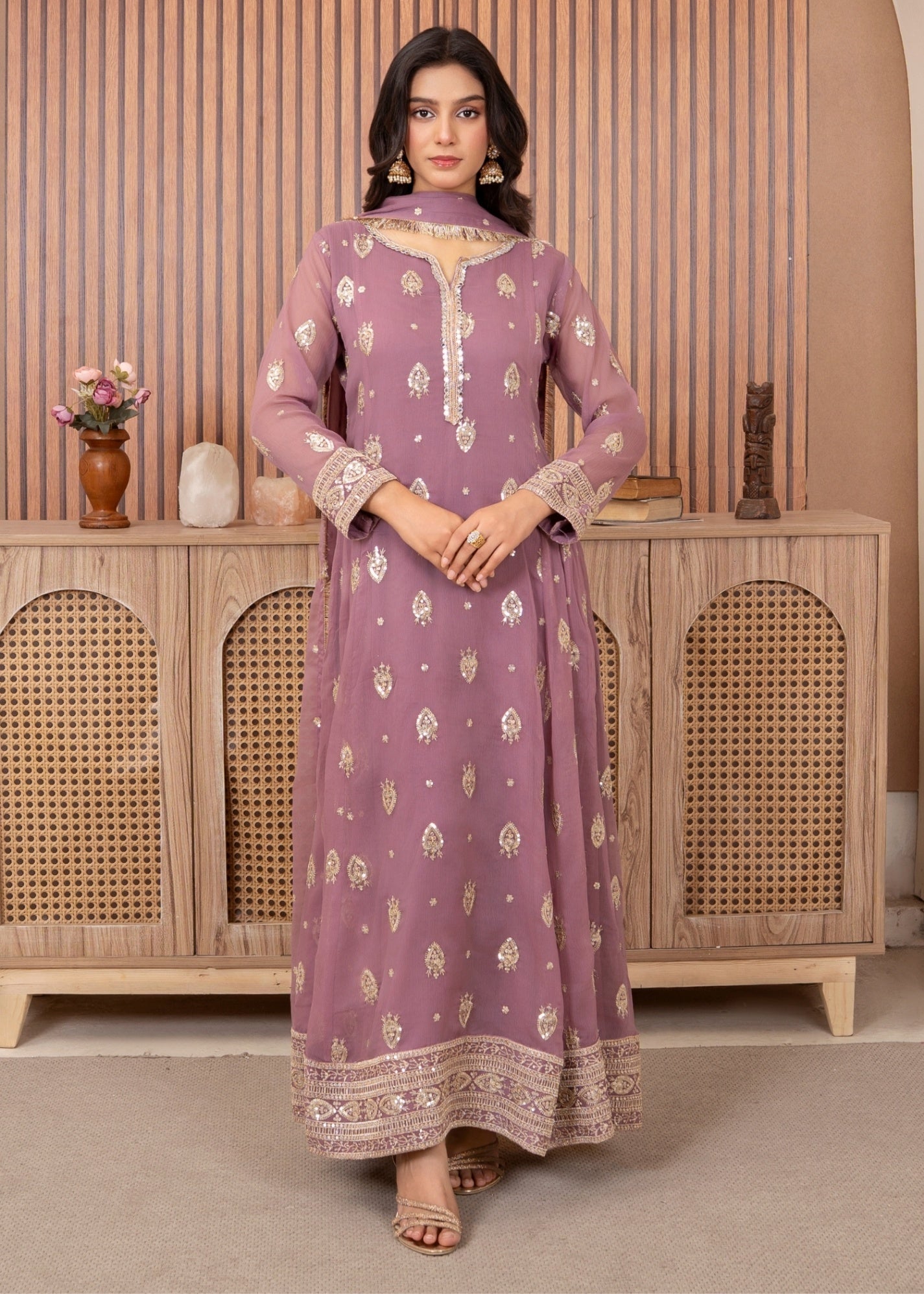 Additional Description:Â Step into grace and sophistication with Raunaq, a beautifully crafted pishwas for festive and party wear. Made from luxurious chiffon, this ensemble features intricate sequin boti work and gheera embroidery, adding a touch of timeless charm.nThe slim-fit silhouette enhances elegance, while the chiffon dupatta, adorned with Sitara boti and kiran lace, completes the regal look. Paired with a crepe trouser, this 3-piece outfit is perfect for all seasons, ensuring style and comfort in every wear.nnDisclaimer: Actual product color may vary slightly