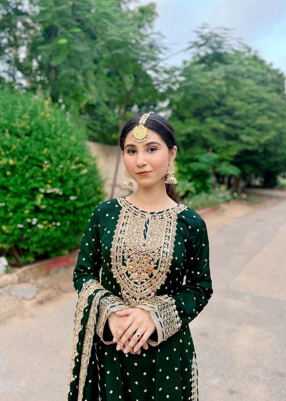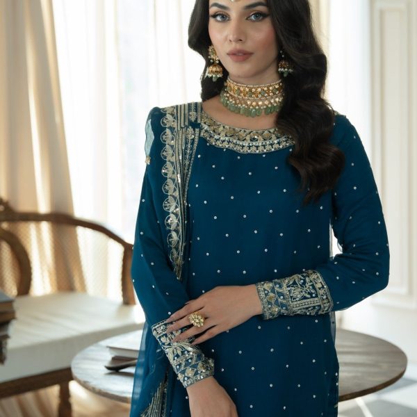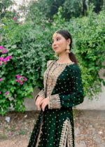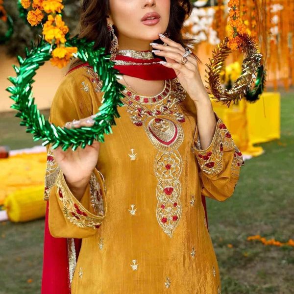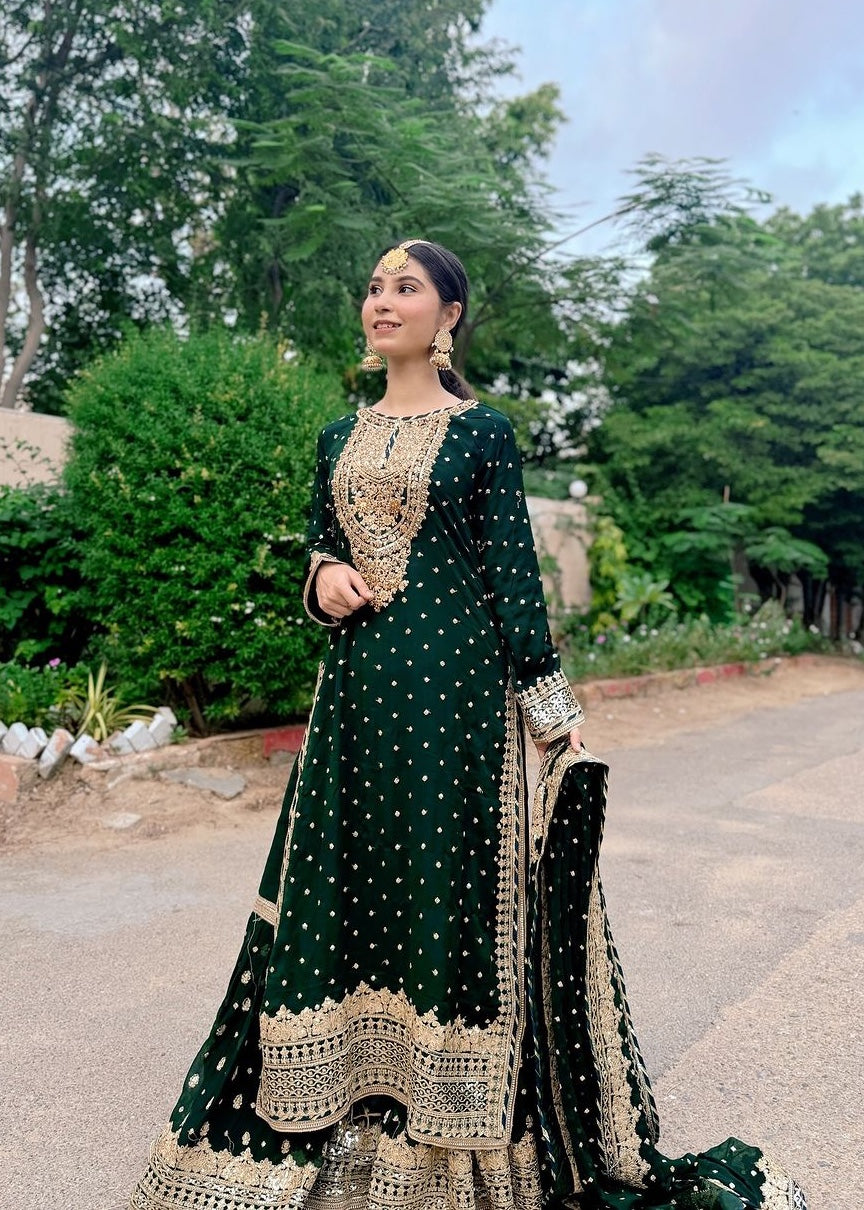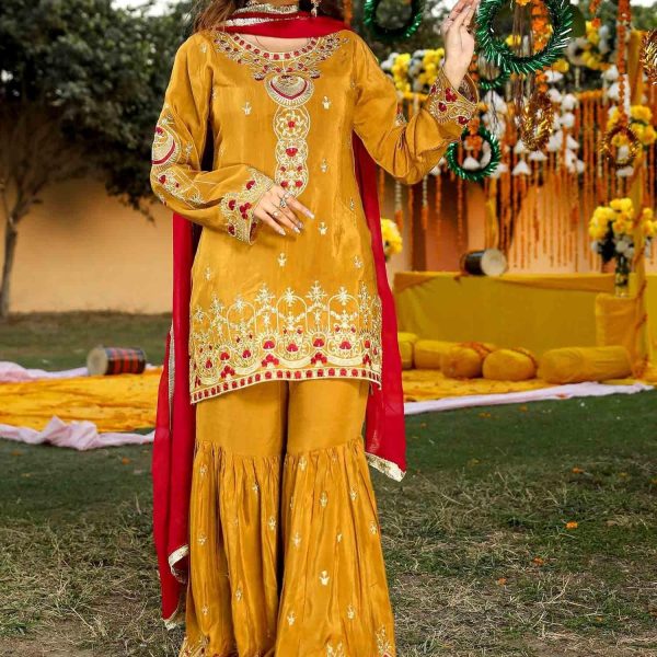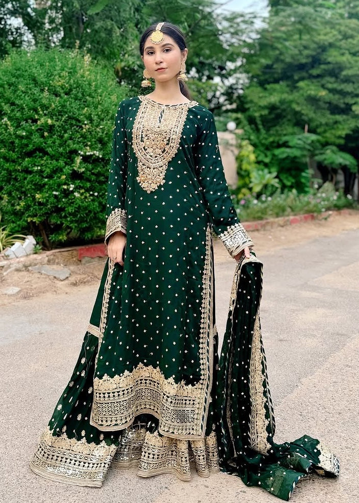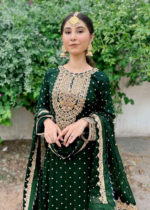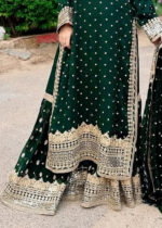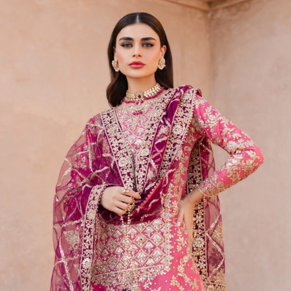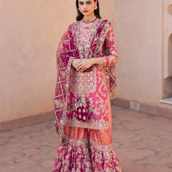 Additional Description:Â A luxurious, heavily embroidered outfit featuring a Full Embroidered Shirt, a stylish Gharara, and an embellished Dupatta. The shirt showcases intricate Neck Hand Embellishments and the back is adorned with Fancy Dori work, adding sophistication and elegance to this traditional, yet contemporary, ensemble. Ideal for weddings or festive occasions.nn