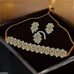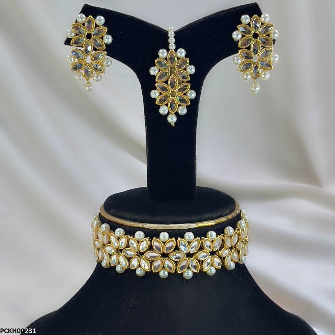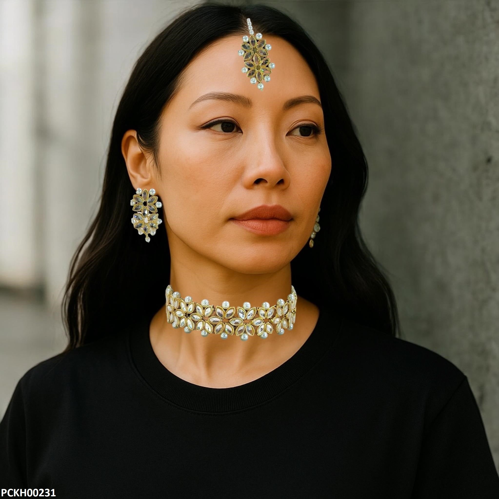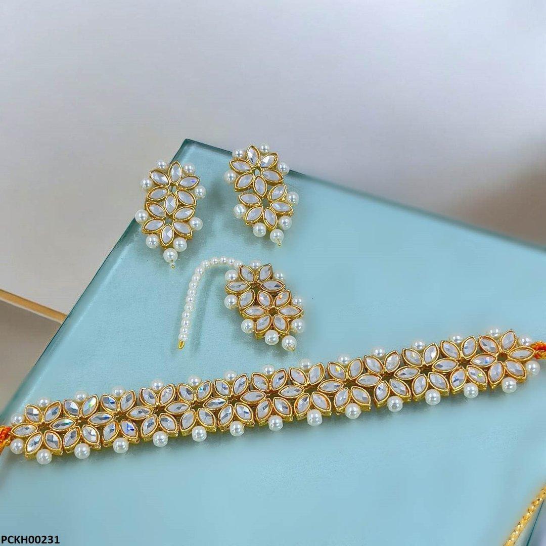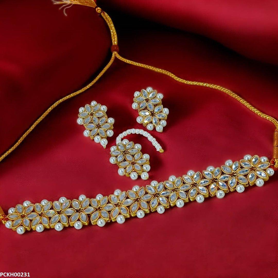 Additional Description: Condition: Brand New nnStone Type: Synthetic/ImitationnnMetal: CoppernnChoker length: 10 inchnnEarrings Size: 4.0cm x 2.0cmnnBindi Size: 8.0cmnnWeight: 85gnnGender: WomennnShape: Marquise FlowernnPlating: Golden PlatednnPackage Include: 1x Choker set, 1x Bindi 1x pair of Tops, nnPacking: Packed In Polybagn