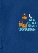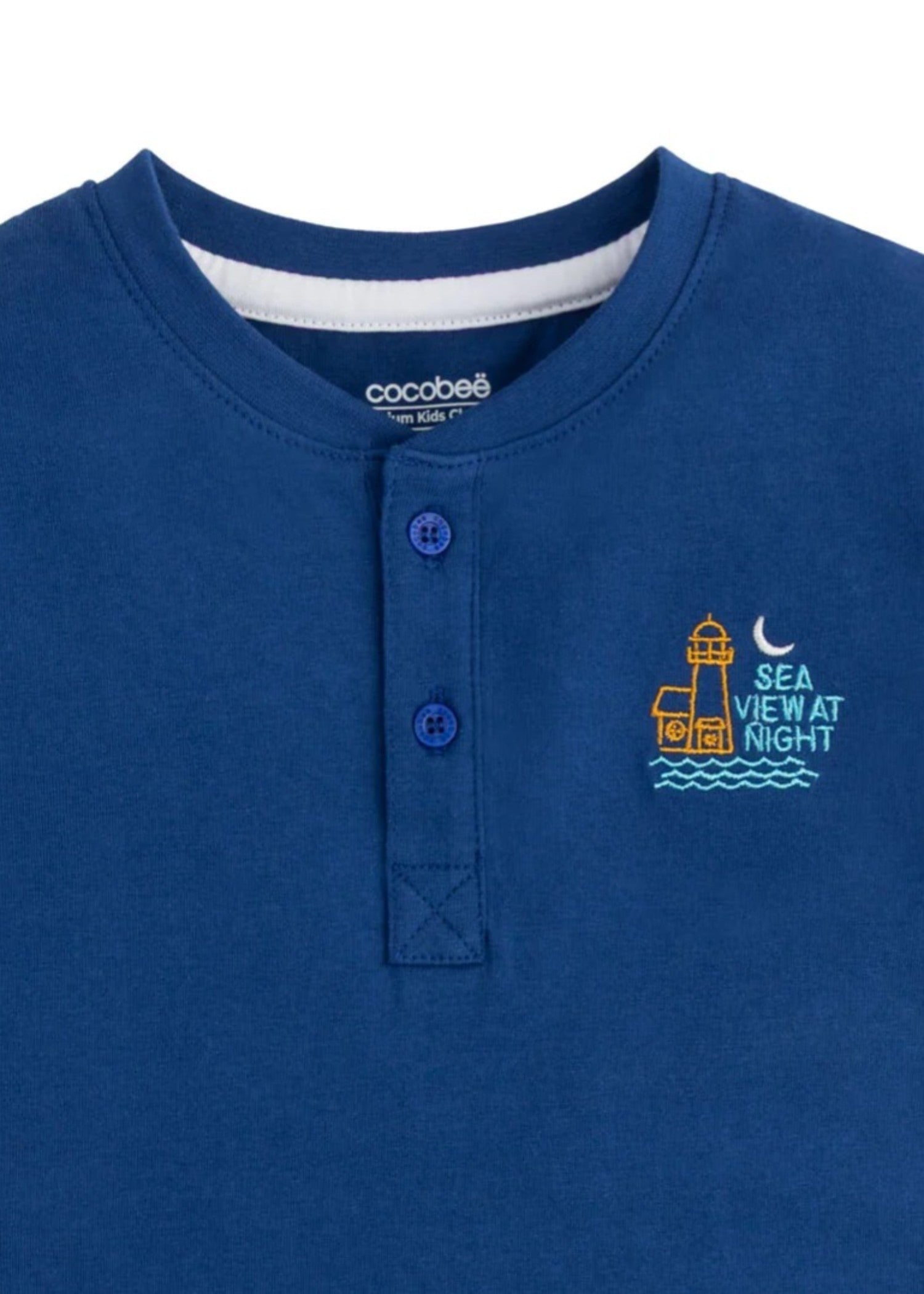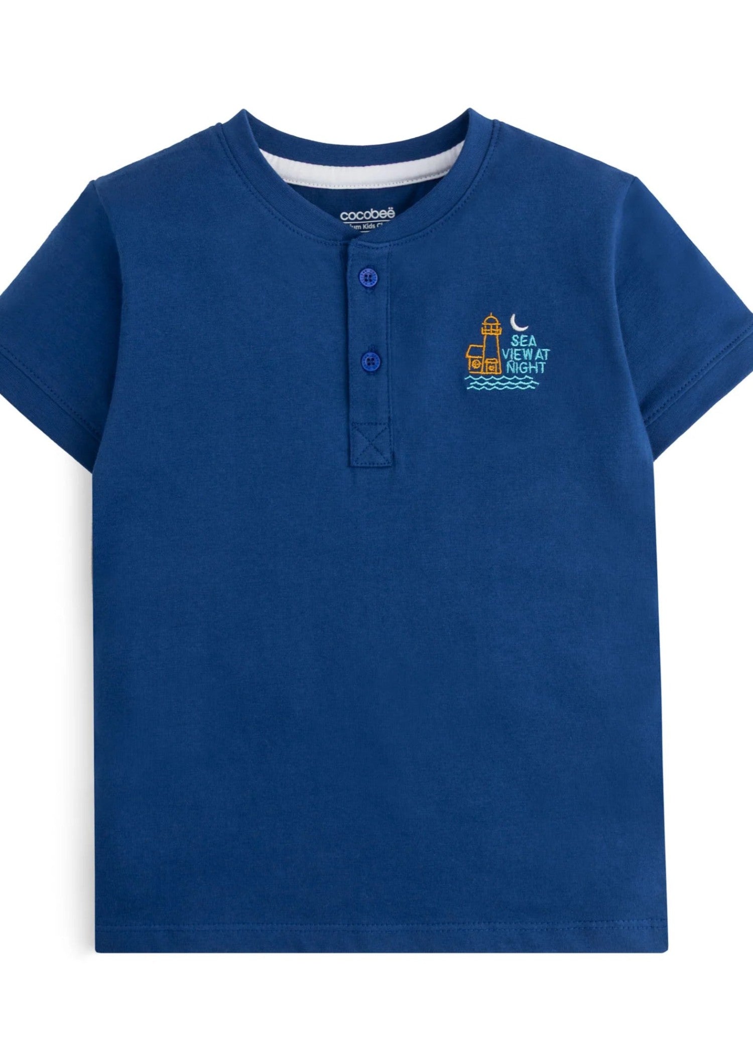 Additional Description:Â A jersey blue henley-style t-shirt with a button placket, short sleeves, and chest embroidery featuring all-day casual wear.nnn