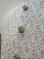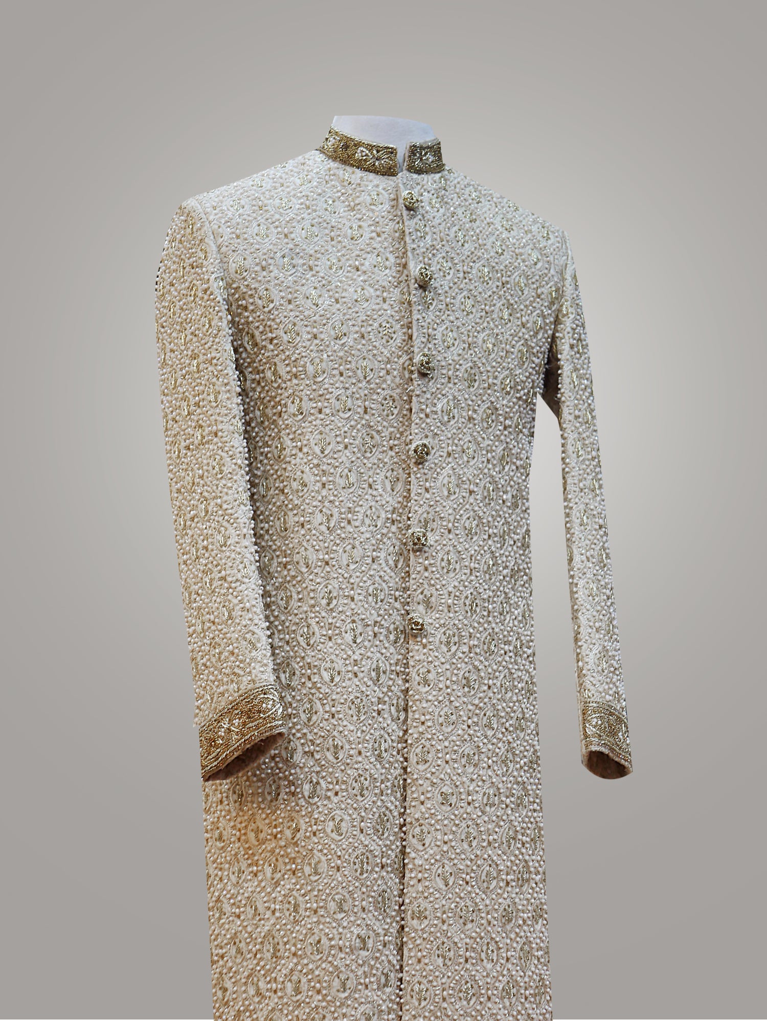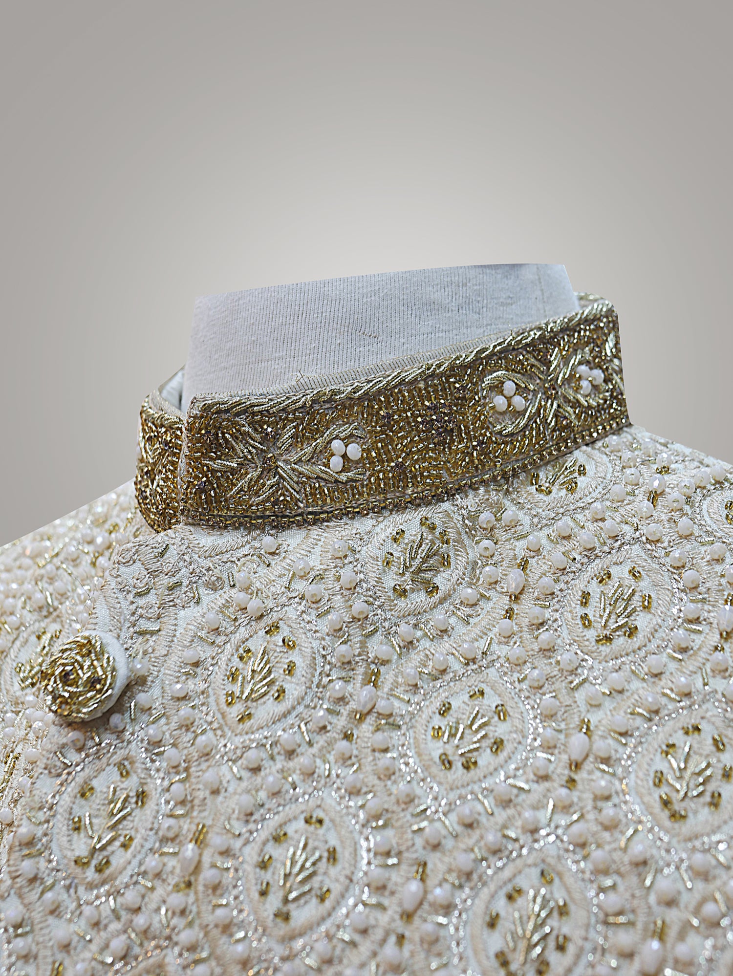 Additional Description:Â sherwani with golden shade and multi color cutt dana workn