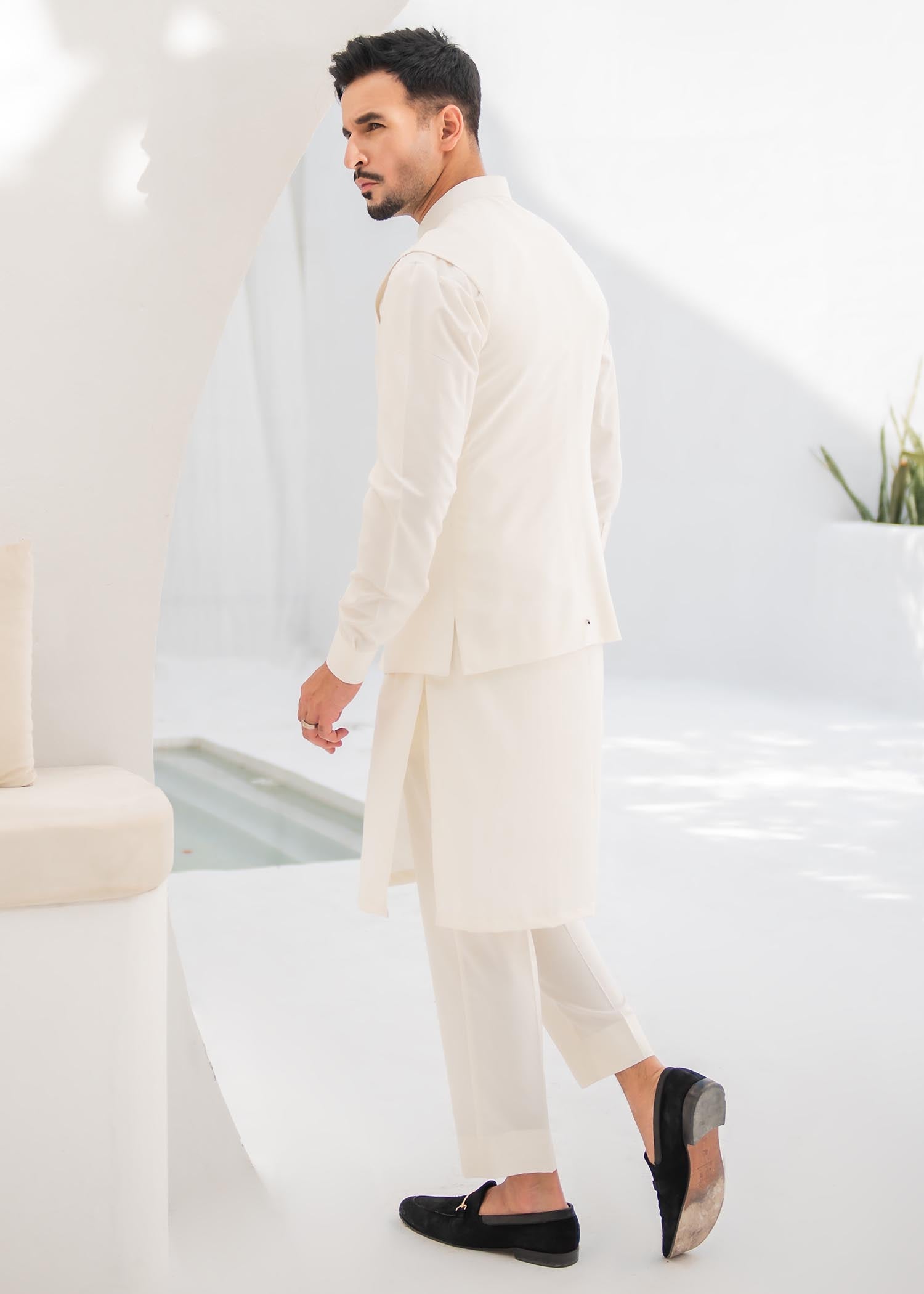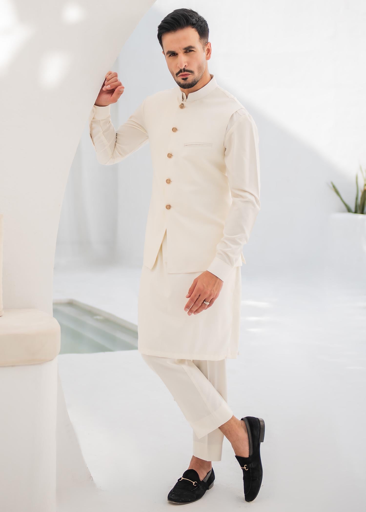 Gender:Â Menn Category:Â Clothingn Outfit Type:Â Easternn Sub-Category:Â Waistcoatn Color Type:Â Whiten Fabric:Â Wash & Wearn Number of Pieces:Â 3 Piece – Top + Bottom + Outerwearn