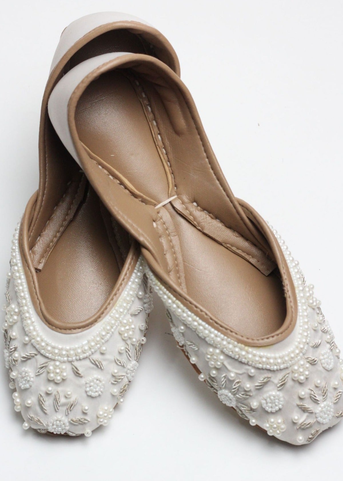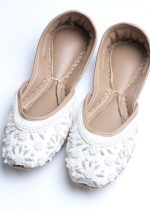 Additional Description: Maintaining the exclusivity, each pair is unique and one of a kind. With skilled craftsmen behind each pair’s fabrication process, from shoe making, design sketching to hand-work, On Your Feets promises to be a treat for your feet.nnCOLOR nWhitennLINING nFaux leathernnPADDING nDouble Cushioning for comfortnnSOLE nLeathernnUPPER nRaw Silkn