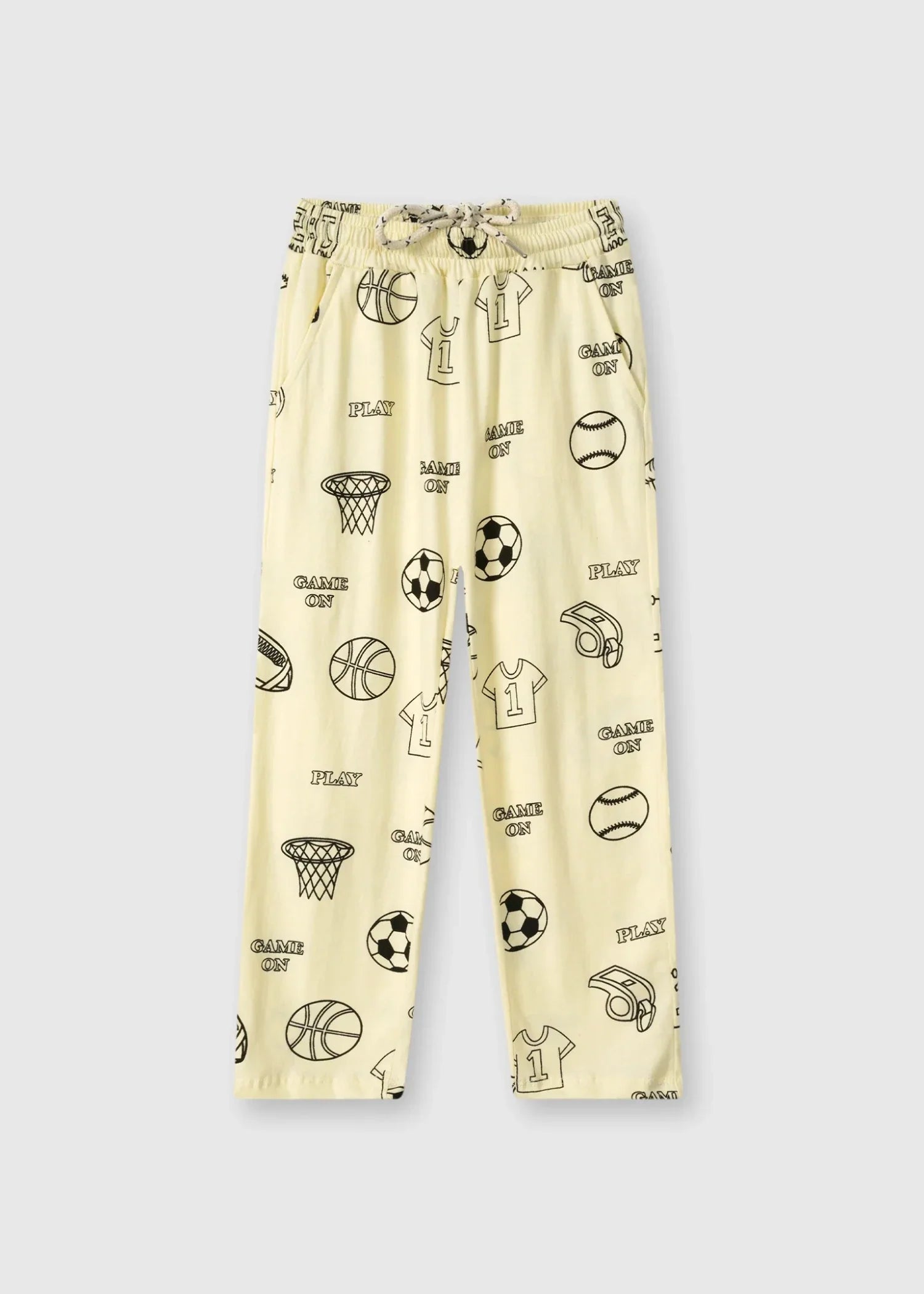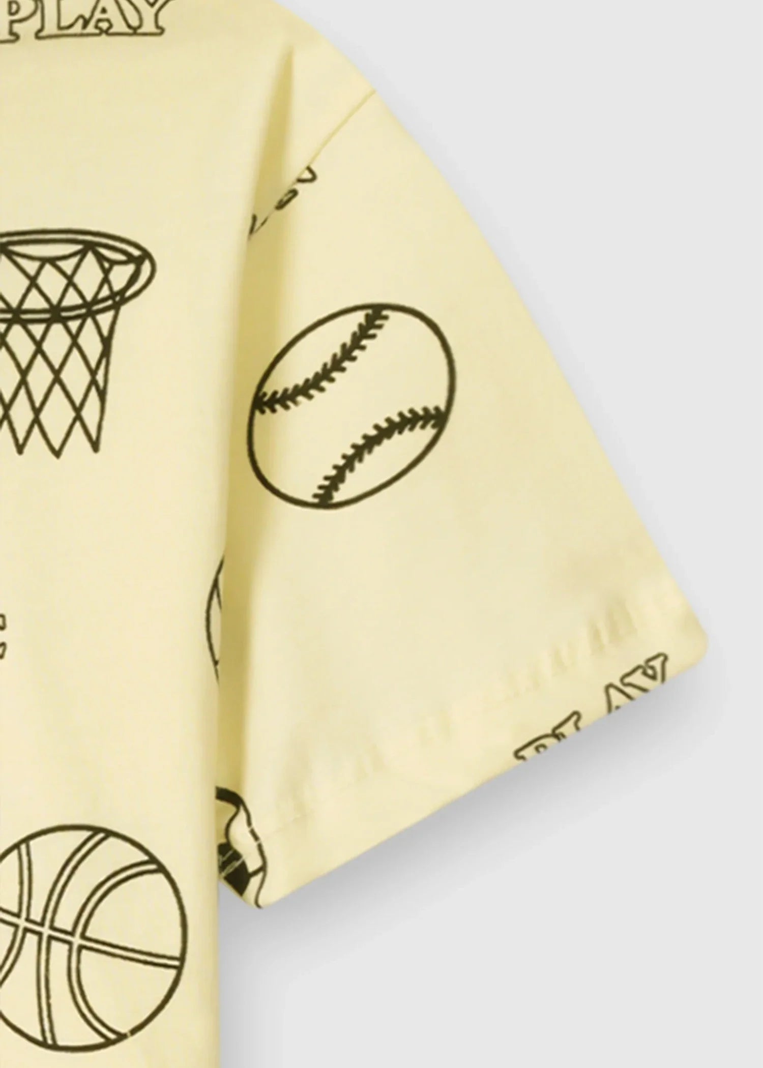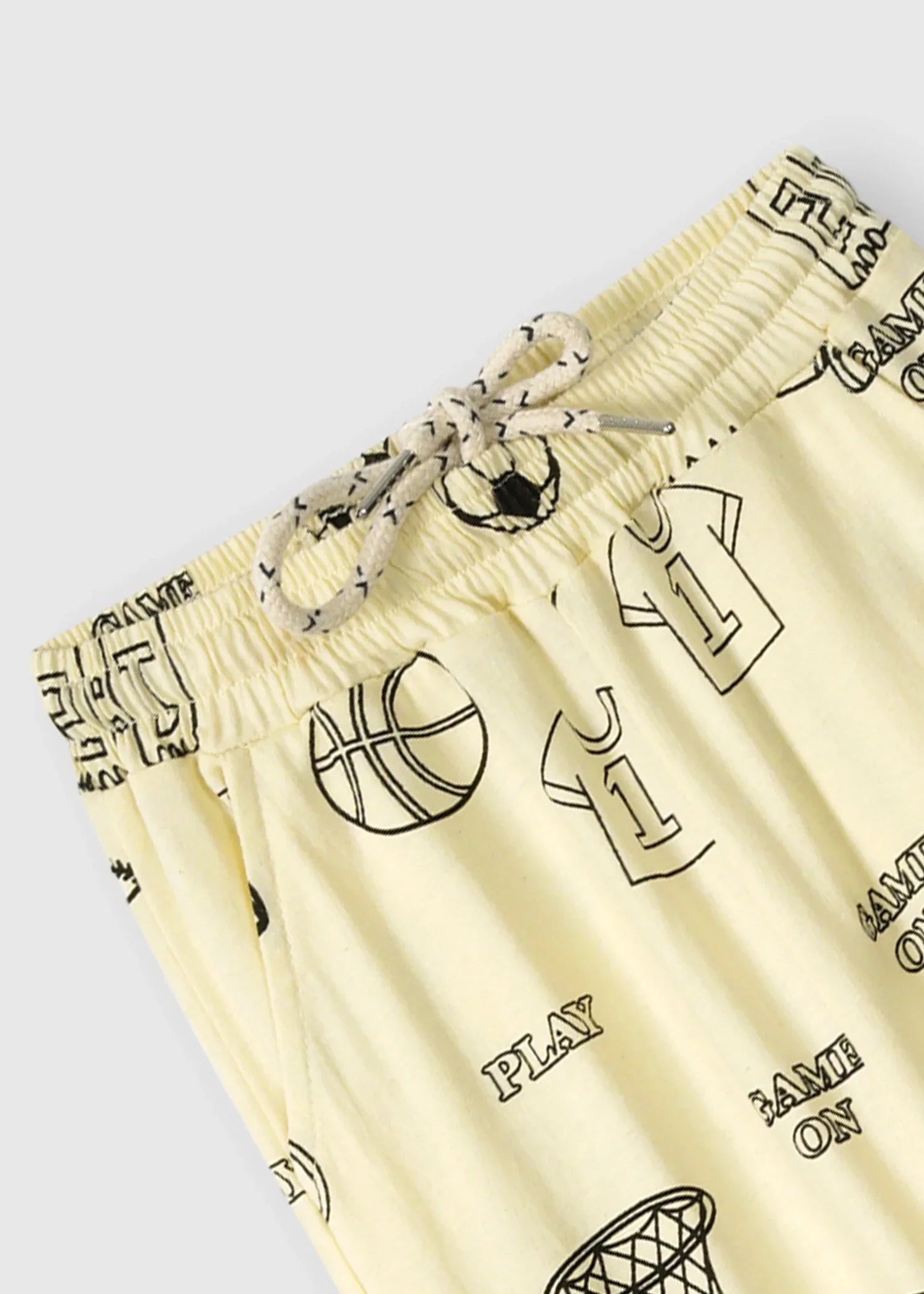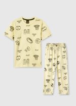 Additional Description:Â Refresh their basics collection with this pure cotton t-shirts and Trouser. Comfy Short Body fit, with Contrast breezy short sleeves and a neat round neck. Includes an all over Print T shirt & Trouser Front Screen Print nnKeeping Your child coolnRound NecknRotary Print nIdeal for summernFabric : 100% Cotton (Jersey)n