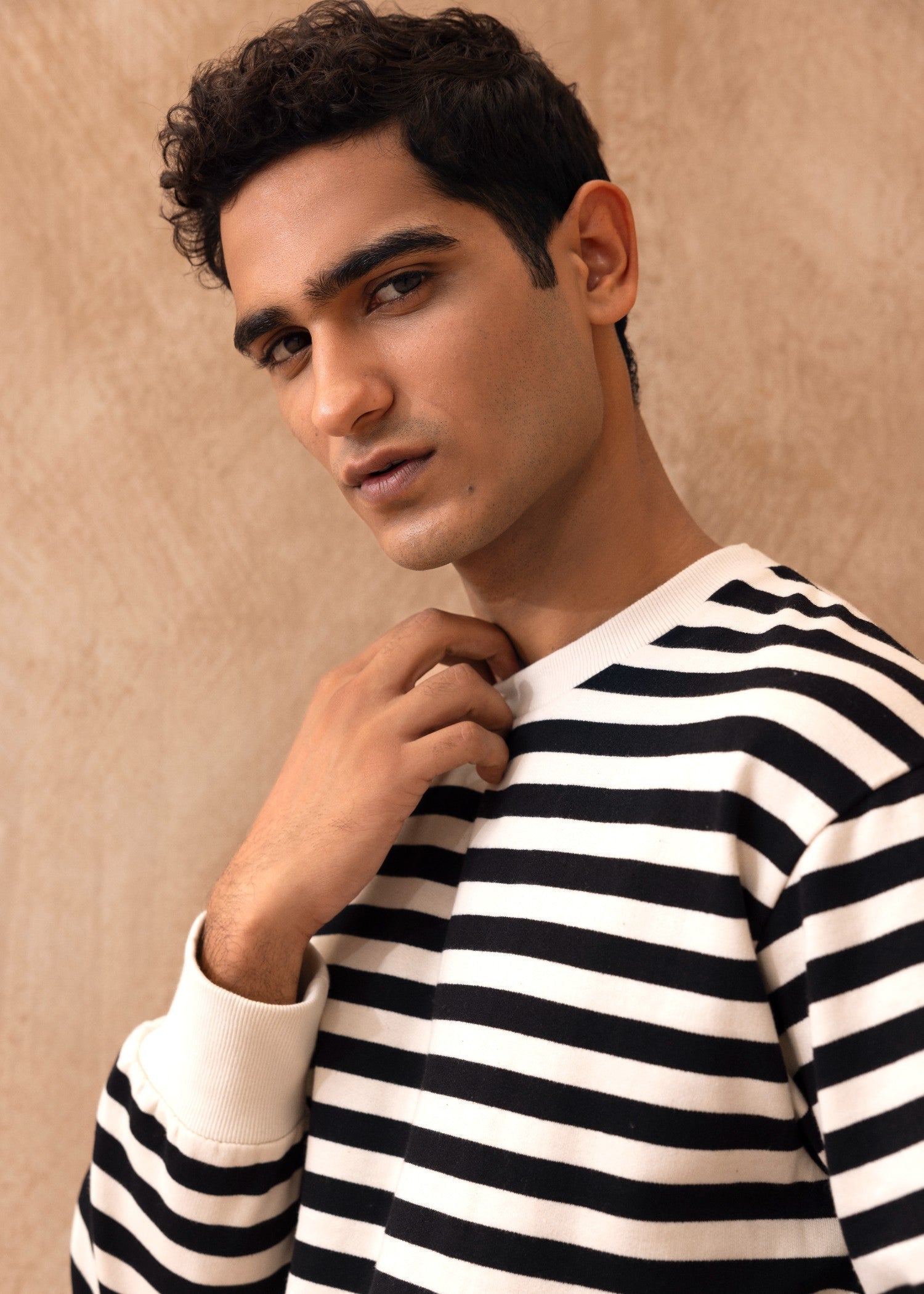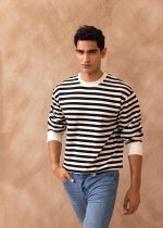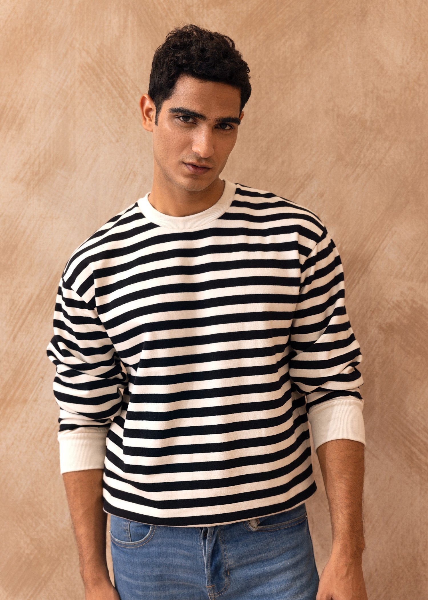 Additional Description: Striped long sleeve sweatshirt with round neckline.nModel is 6’1 and wearing medium size.nFabric: Knit fleecen