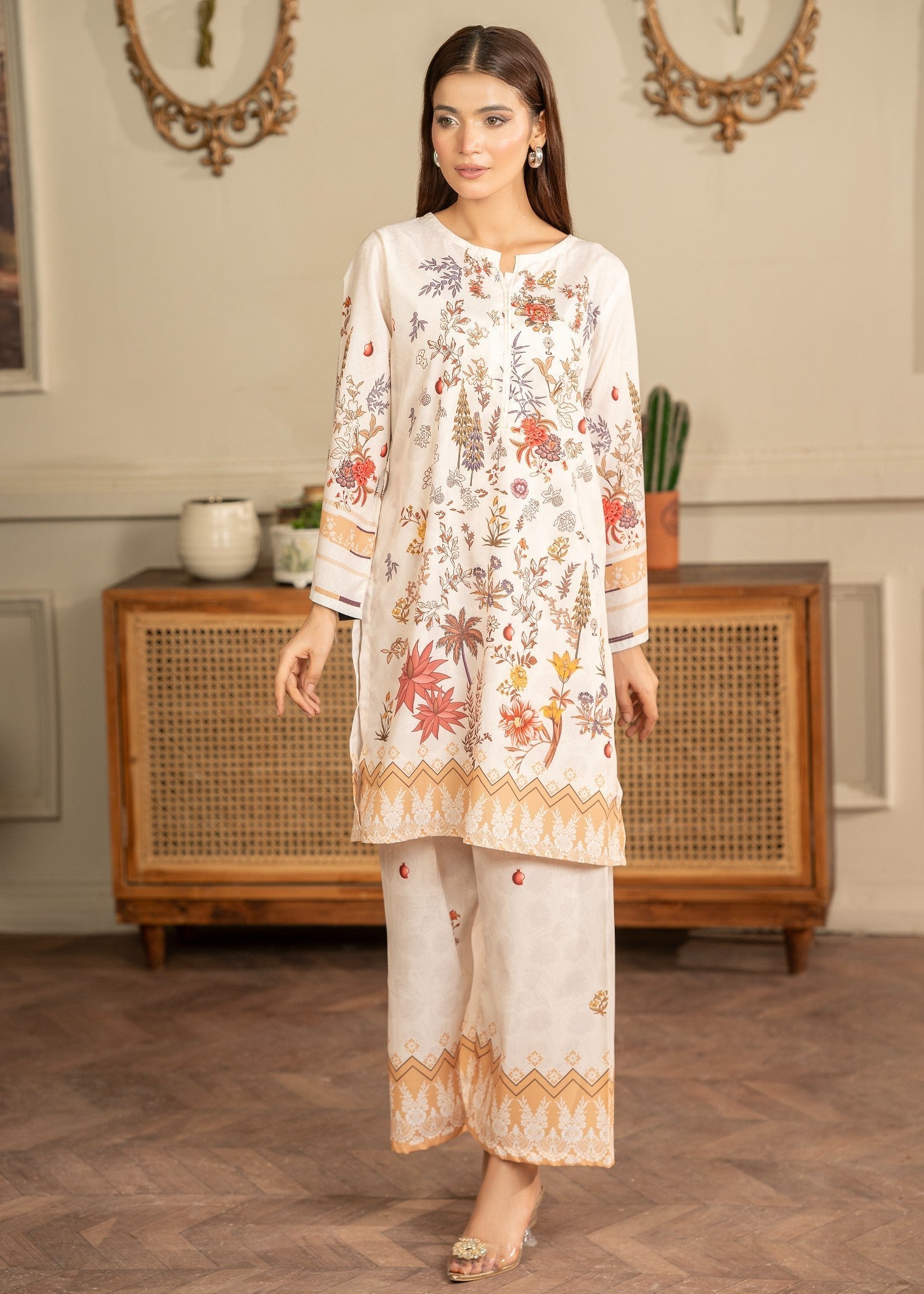 Gender:Â Womenn Category:Â Clothingn Outfit Type:Â Eastern Ready to wearn Sub-Category:Â Co Ord Setsn Bottom Style:Â Straight Trousern Color Type:Â Whiten Lining Attached:Â No Liningn Number of